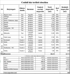 Burkolatok: Fagyálló mázas kerámia (terasz, garázs, vizes helyiségek), parketta (szobák, emelet).